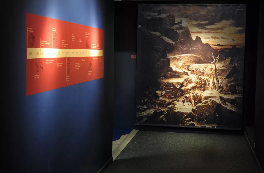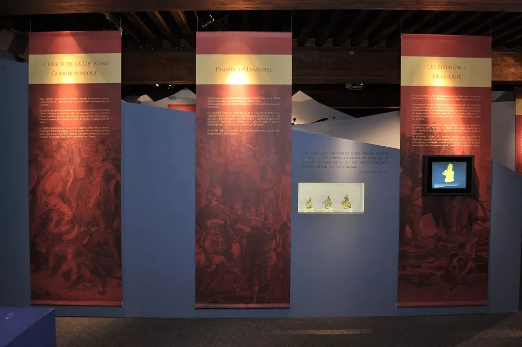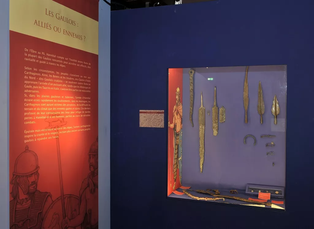 L’exposition esquisse le portrait d’un personnage controversé et son aventure alpine, à la lumière des sources archéologiques, historiques, littéraires et artistiques. Une collection constituée d’armements punique, gaulois et romain complétée par des reconstitutions animées des stratégies militaires, illustrent cette épopée.