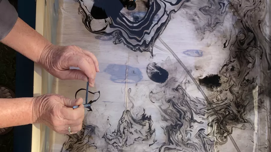 Cette technique ancienne de marbrure, consiste à faire flotter de l’encre sur la surface de l’eau pour former des motifs uniques et ondulants. Les compositions sont ensuite capturées sur papier ou textile.