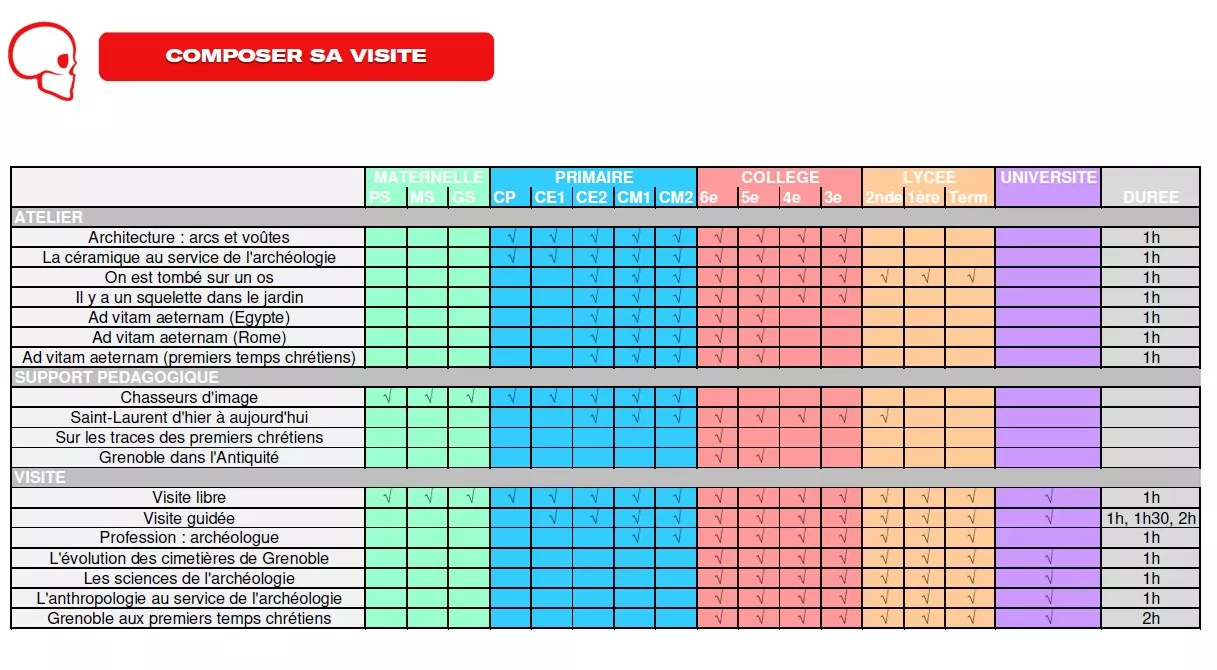 Les recherches archéologiques à Grenoble ont a permis de mettre en évidence les principales phases d'évolution des aires funéraires de la ville. A travers cette visite atypique, les élèves pourront comprendre comment les changements de mentalités et les croyances de chaque époque ont pu transformer les cimetières de Grenoble.
